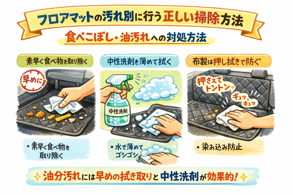 車内で発生する汚れは、日常の行動が原因になることが多いです。結論として、食べこぼしや飲みこぼしがマットに付着することで、汚れが定着しシミや臭いの原因になる という特徴があります。理由は、食品に含まれる油分や糖分が繊維にしみ込み、完全に落ちにくくなるためです。
