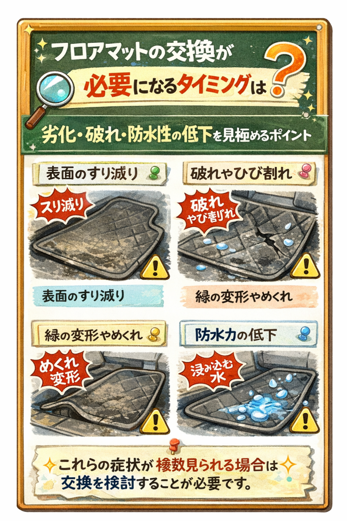 フロアマットを早めに交換することには、明確なメリットがあります。まずは、交換が必要になる状態を整理すると次のようになります。